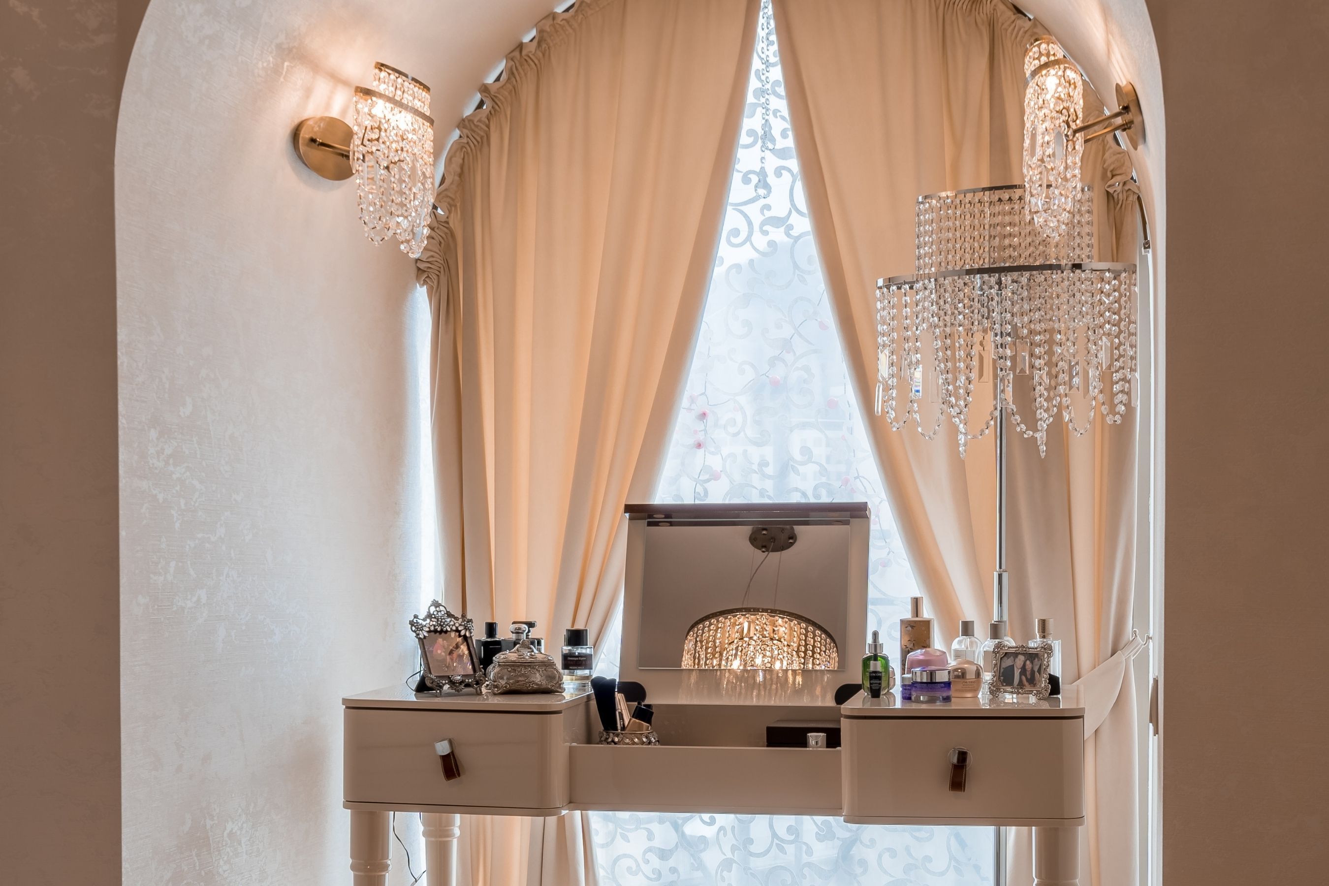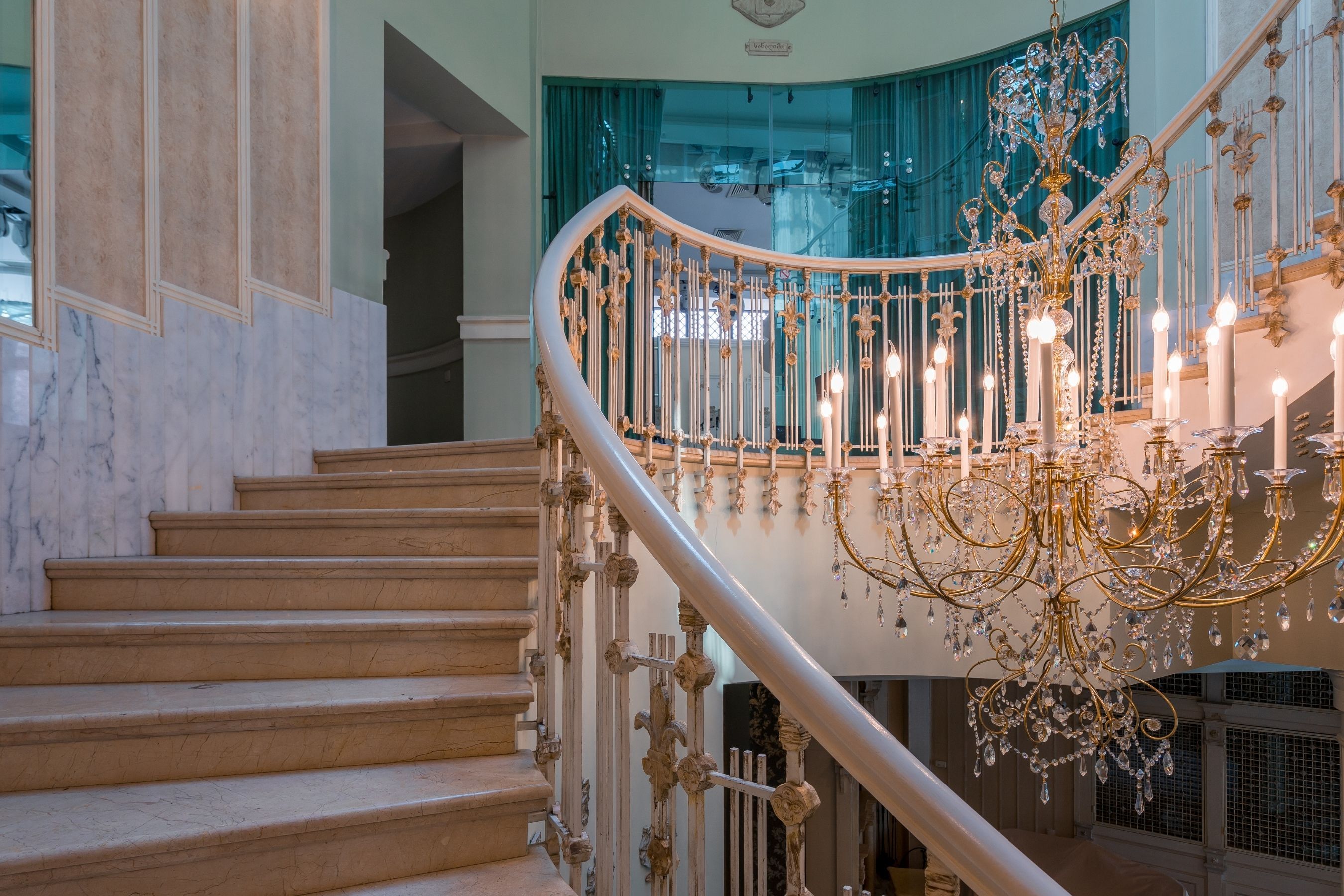 Die prunkvolle Wendeltreppe des Hotels wurde ihrer majestätischen Wirkung entsprechend mit einem Großluster und mehrflammigen Wandleuchten der Serie KATHARINA ausgestattet. Die Hotelzimmer schmücken Kristallleuchten der Serie KRISTALLDESIGN in verschiedenen Ausführungen.