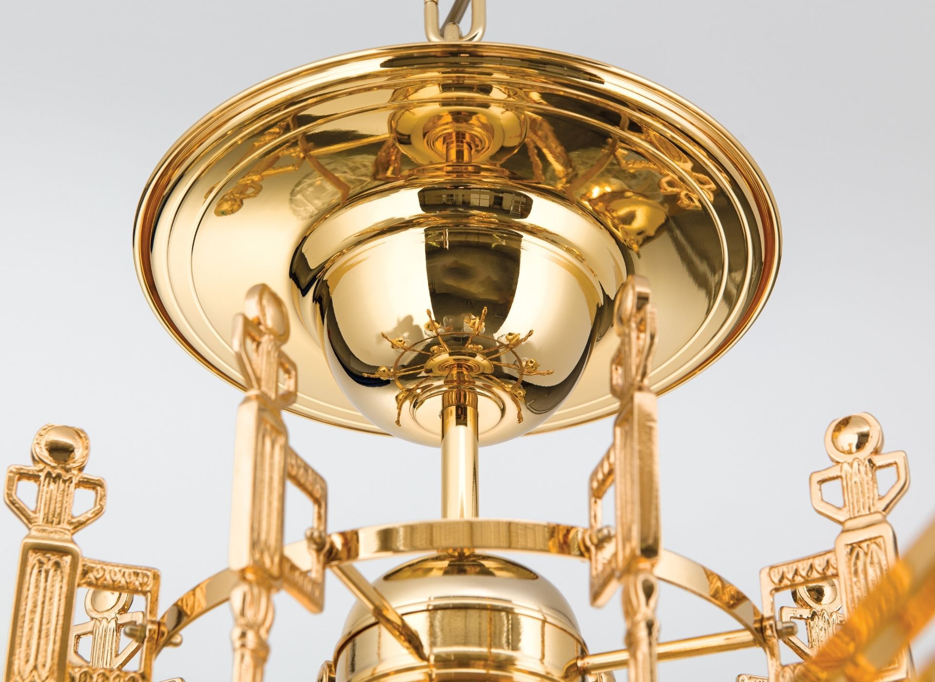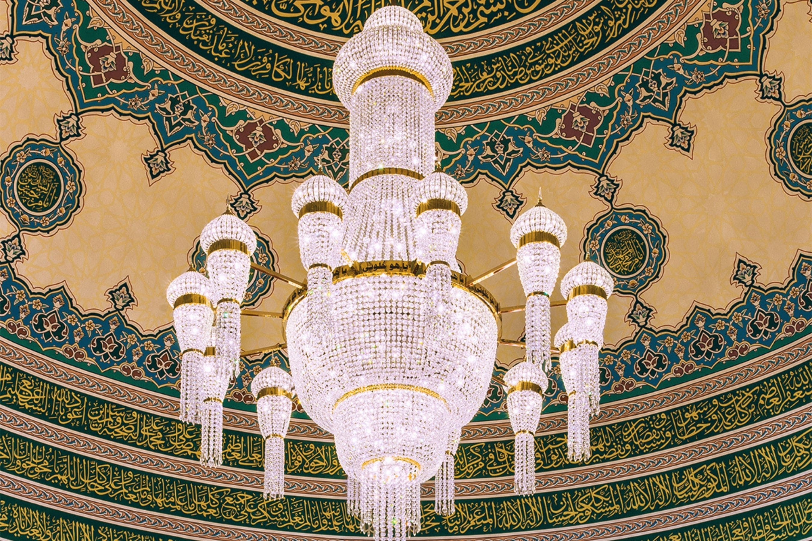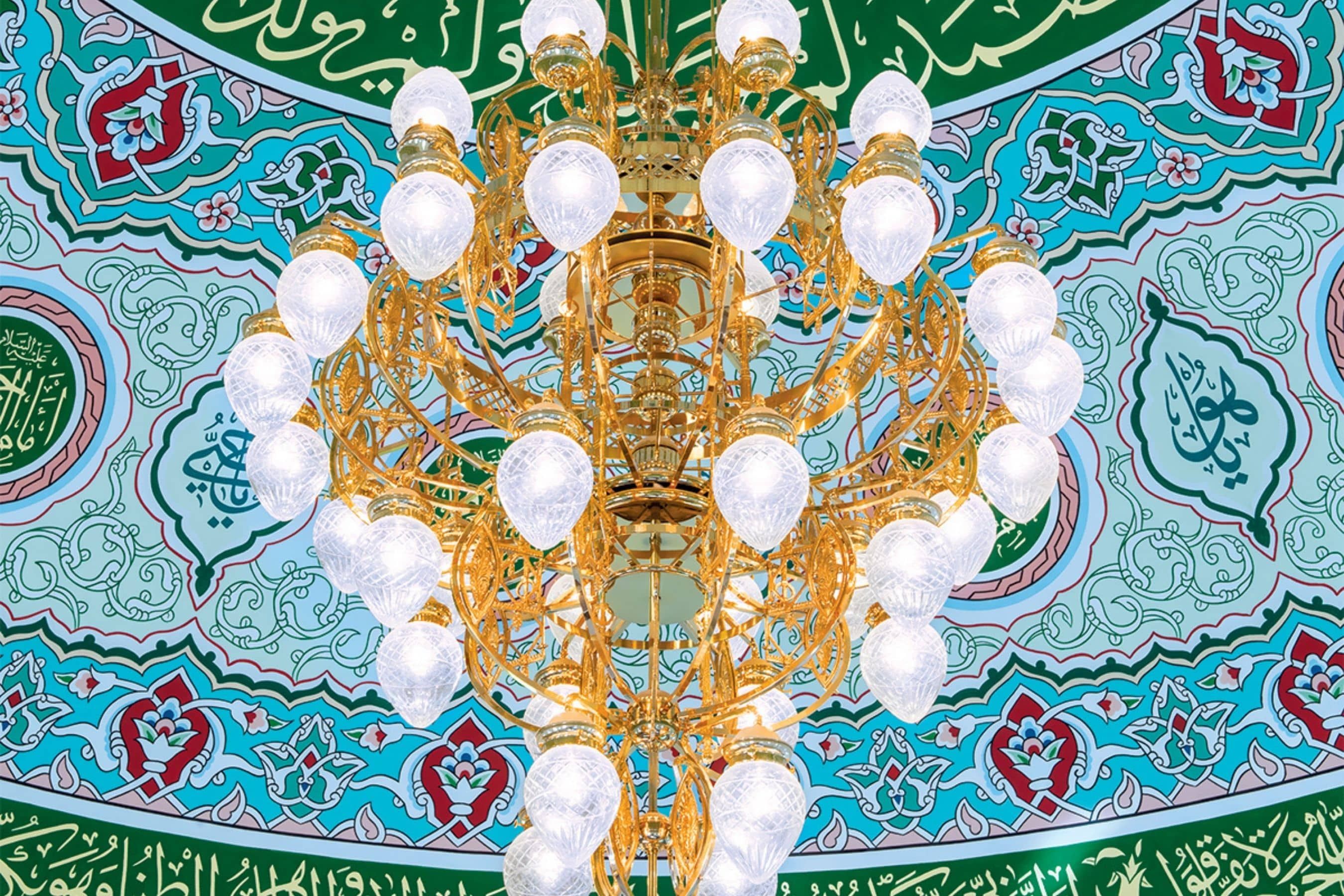 Zur Lieferung gelangte dabei unter anderem eine knapp vier Meter große Sonderanfertigung der Serie „Design by ORION: ORIENTAL“. Die Zierbänder dieser Großleuchte wurden mittels Lasertechnik mit arabischen Schriftzeichen versehen. Auch die zum restlichen Leuchtendekor passenden vergoldeten Säulenverkleidungen wurden von ORION gefertigt und zusammen mit den Wandleuchten installiert.