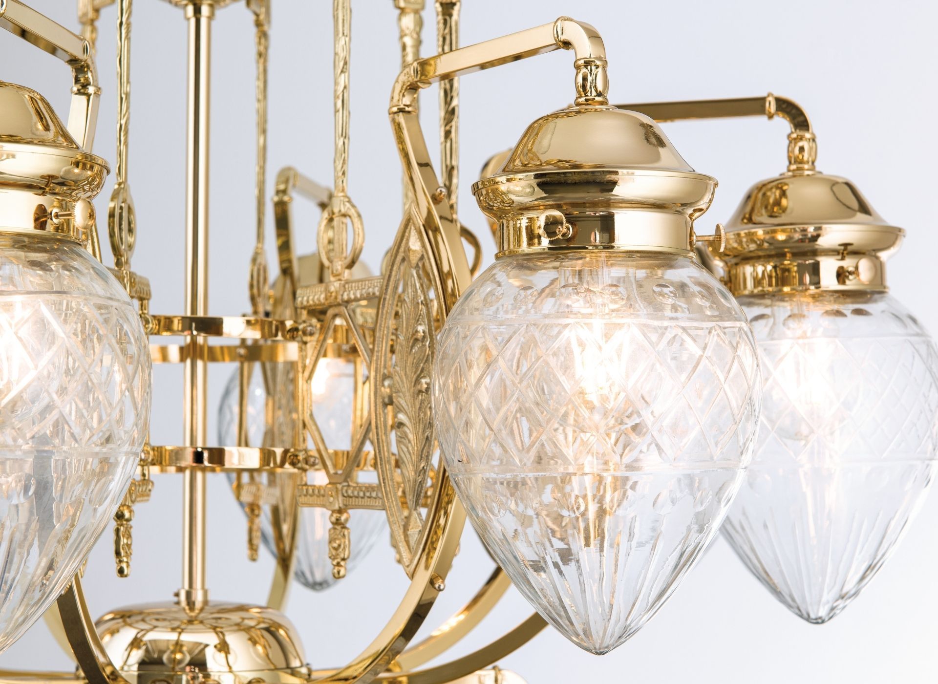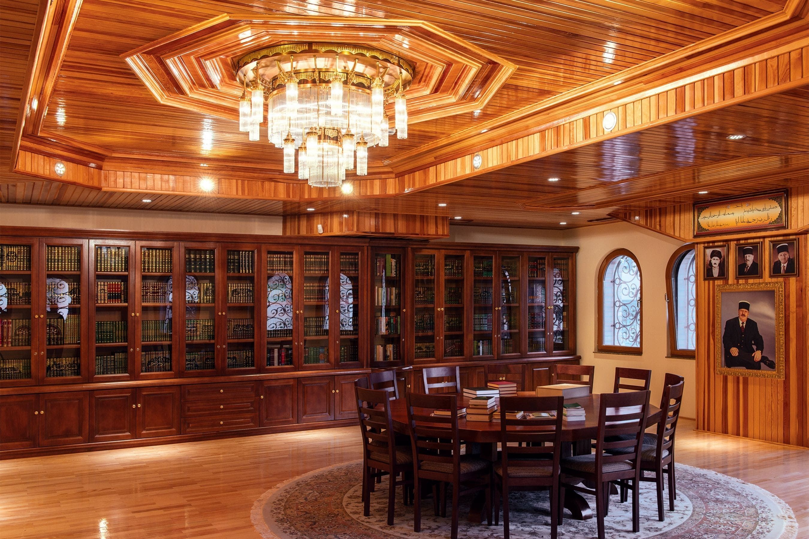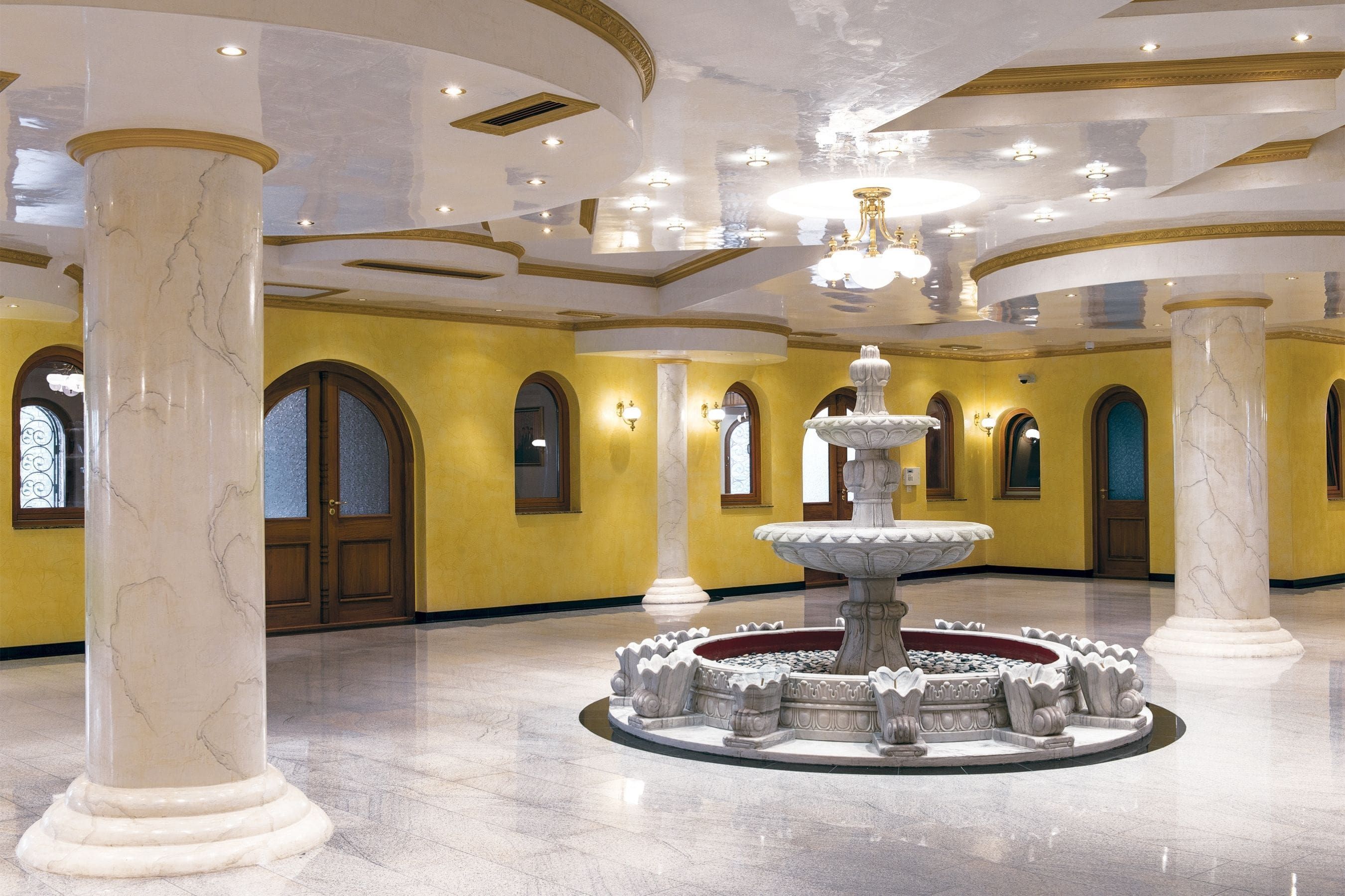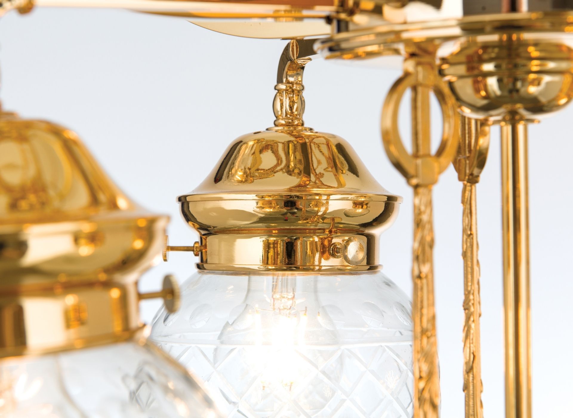 Zur Lieferung gelangte dabei unter anderem eine knapp vier Meter große Sonderanfertigung der Serie „Design by ORION: ORIENTAL“. Die Zierbänder dieser Großleuchte wurden mittels Lasertechnik mit arabischen Schriftzeichen versehen. Auch die zum restlichen Leuchtendekor passenden vergoldeten Säulenverkleidungen wurden von ORION gefertigt und zusammen mit den Wandleuchten installiert.
