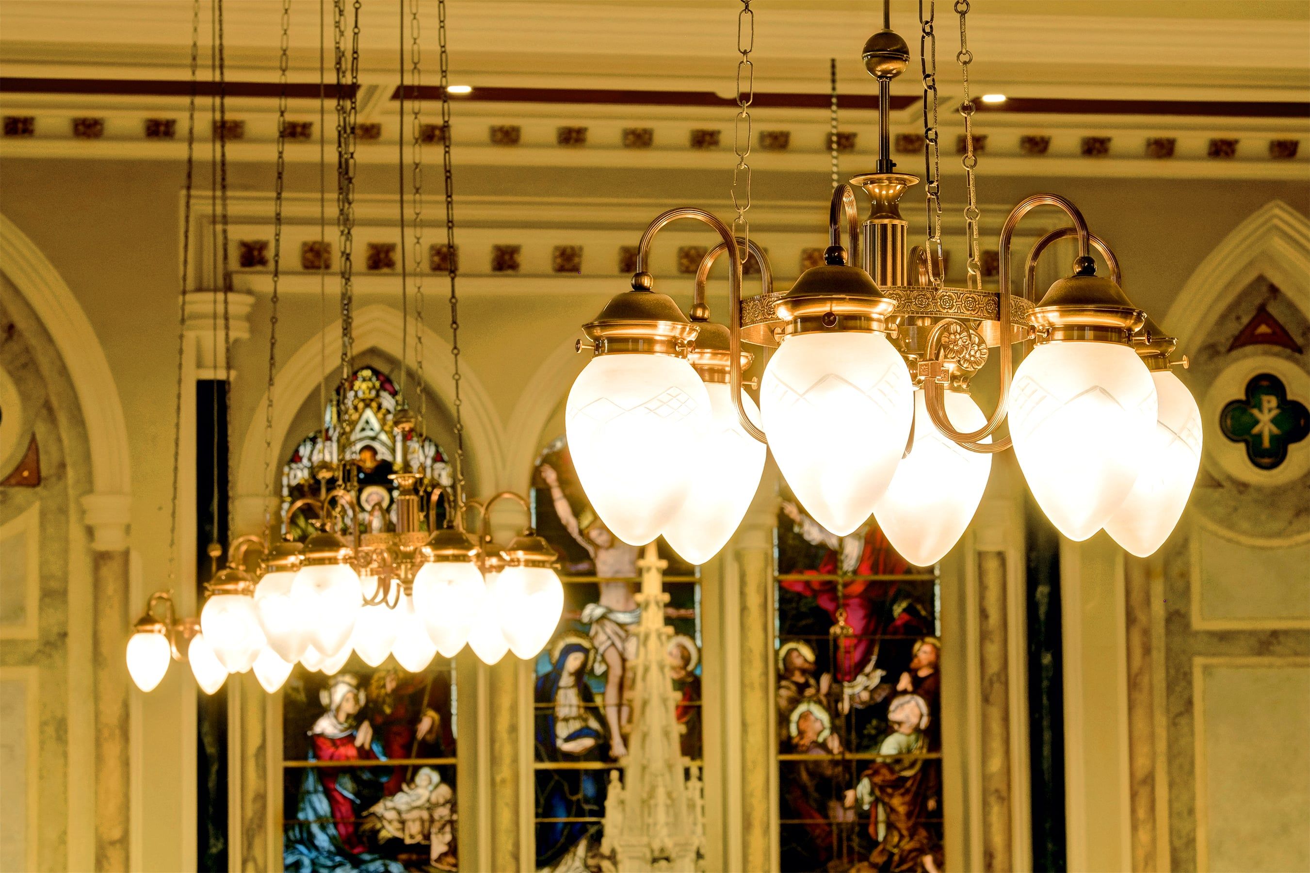 Das Grundkonzept der Leuchten für dieses Projekt entstammt der „Design by ORION“-Serie „STÄBCHENSERIE“. Jedoch sind keine Stäbchen an den Leuchten zu finden, sondern satinierte Glaskörper in Traubenform mit Diamantschliff. Die Abhängung der Luster in Form von drei Ketten mit geprägten Messingkettengliedern passt sich ebenfalls gut in das neue Design. Die Realisierung dieses Projektes für die St. Patricks Church konnte innerhalb kürzester Zeit ab Bestellung erfolgen, da die Adaptionen an Basismodellen vorgenommen wurden. Die klassischen Leuchten wurden zur Gänze mit LED Leuchtmitteln ausgestattet. Damit konnte eine starke Ausleuchtung von über 1000 lm pro Glasabdeckung erreicht werden.